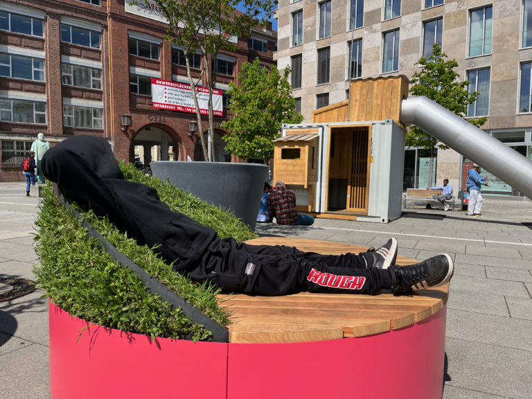 Erste Projekte im Rahmen des Programms „Zukunft Innenstadt“ sind bereits sichtbar geworden – seit einigen Wochen schmücken ein Spielecontainer und Pflanzkübel den Bahnhofsplatz in Rüsselsheim. Am nächsten Wochenende soll weiteres Mobiliar den Platz begrünen und beleben. Wir wollten schon am vergangenen Sonntag wissen: Wie kommt die neue Gestaltung bei der Rüsselsheimer Stadtgesellschaft an. Gesagt werden kann, dass der Großteil der Teilnehmenden die Entwicklungen des Projekts durchaus begrüßt, sich aber intensivere Maßnahmen, wie weitere begrünende Elemente, Begegnungs- und Spielmöglichkeiten, eine buntere Gestaltung und eine Ausdehnung des Projekts auf die ganze Innenstadt, wünscht.